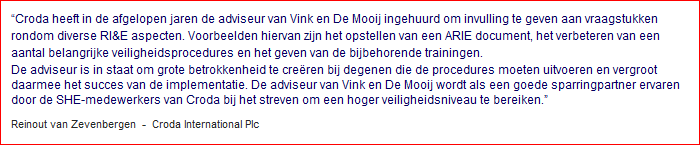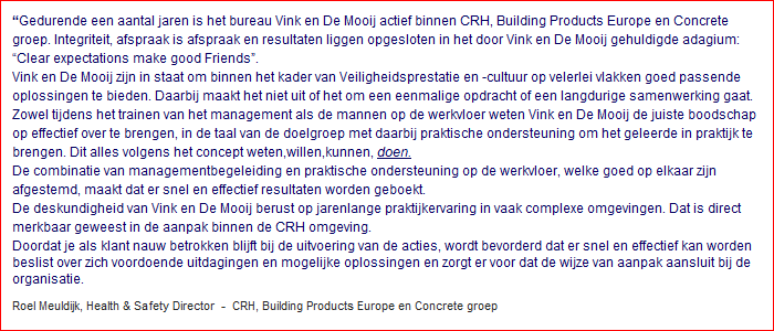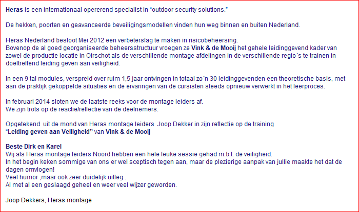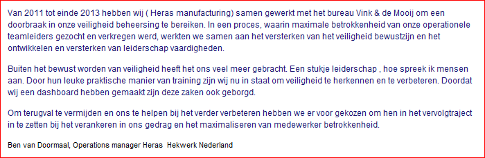 | "Van 2011 tot einde 2013 hebben wij ( Heras manufacturing) samen gewerkt met het bureau Vink & de Mooij om een doorbraak in onze veiligheid beheersing te bereiken." Ben van Doormaal, Operations manager Heras Hekwerk Nederland > lees verder |