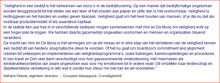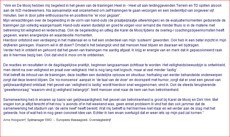 | “De ‘no-nonsense’ aanpak in ‘de taal van de vloer’ en doorspekt met humor, ...” Arno Hoogwerf, Spilmanager - Europees Massagoed - Overslagbedrijf > lees verder |