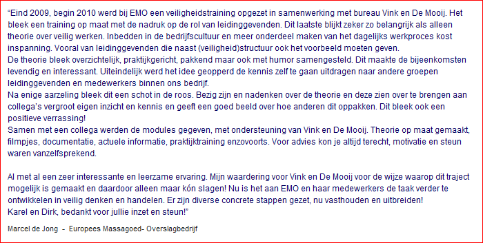 | “Bezig zijn en nadenken over de theorie, deze overbrengen aan collega’s vergroot eigen inzicht en kennis.” Marcel de Jong - Europees Massagoed - Overslagbedrijf > lees verder |