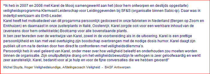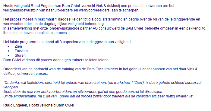 | " Bij de eindevaluatie, na 2 weken, bleek dat dit proces zowel door trainers als de cursisten als zeer nuttig ervaren is”. Ruud Engelen, Hoofd veiligheid Bam Civiel > lees verder |