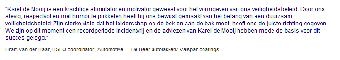 | “We zijn op dit moment een recordperiode incidentvrij dankzij de goede adviezen.” Bram van der Haar, HSEQ coordinator, Automotive - De Beer autolakken/ Valspar coatings > lees verder |